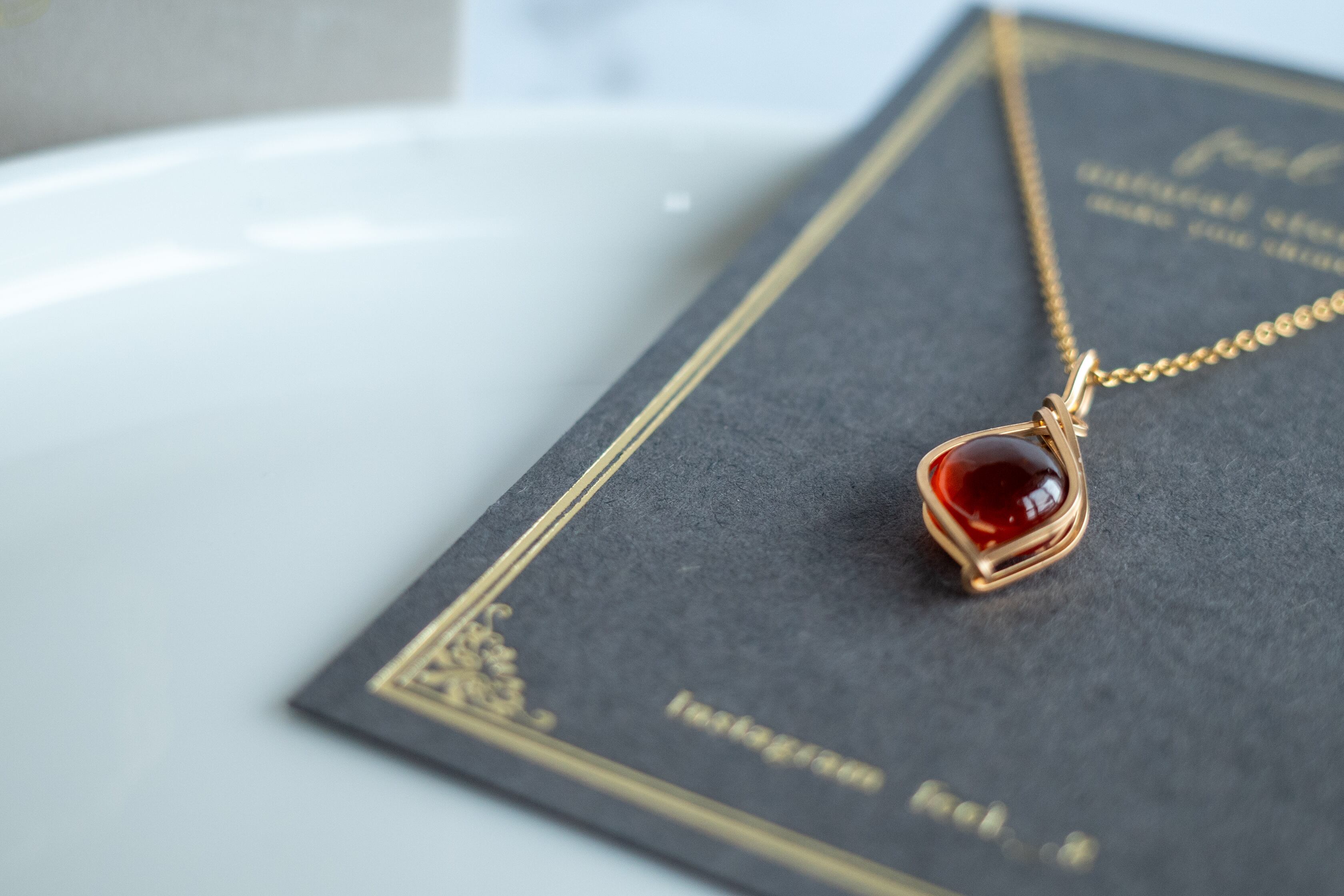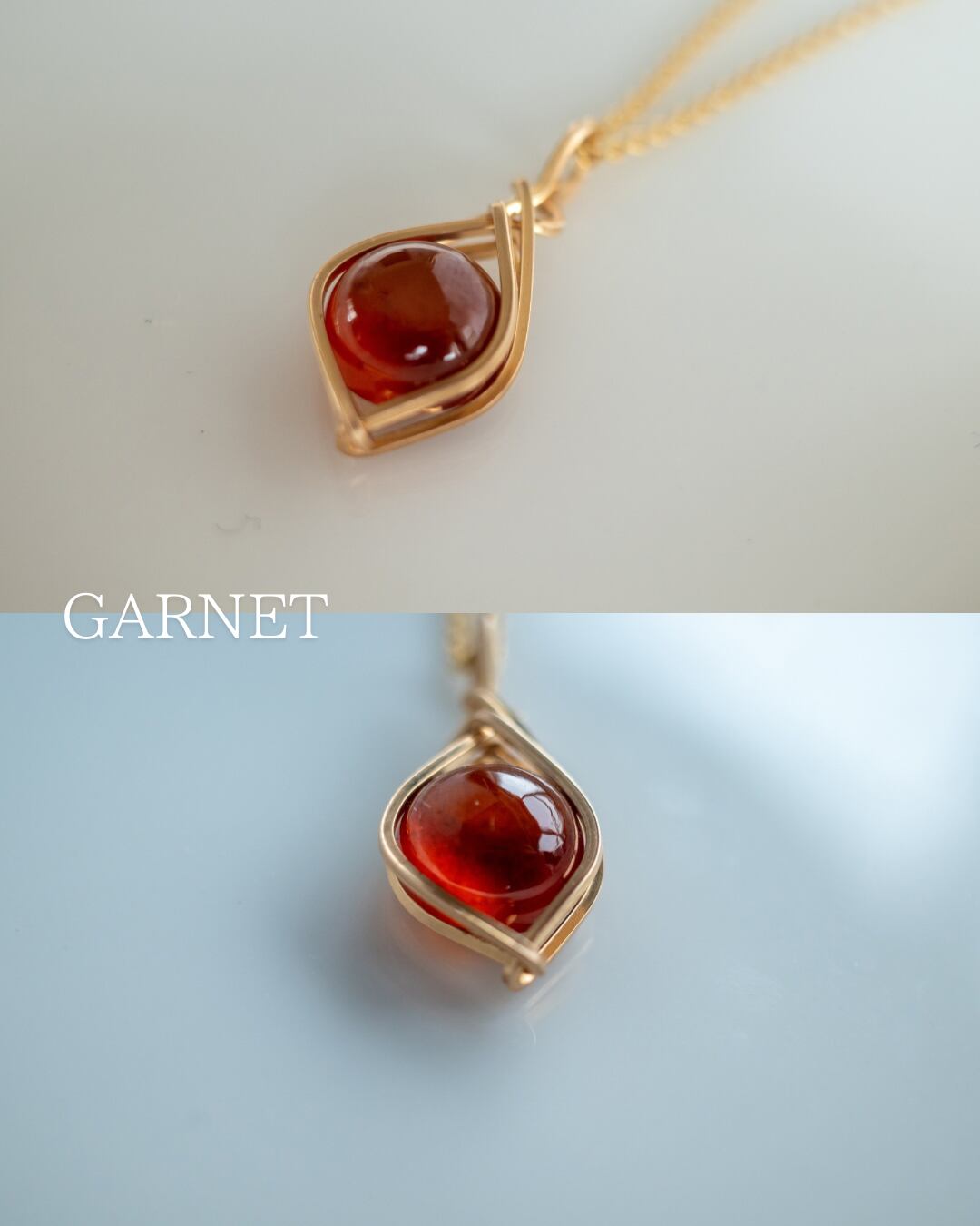 深い赤が印象的な天然石「ガーネット」を、ナチュラルで優しい雰囲気のネックレスに仕立てました。